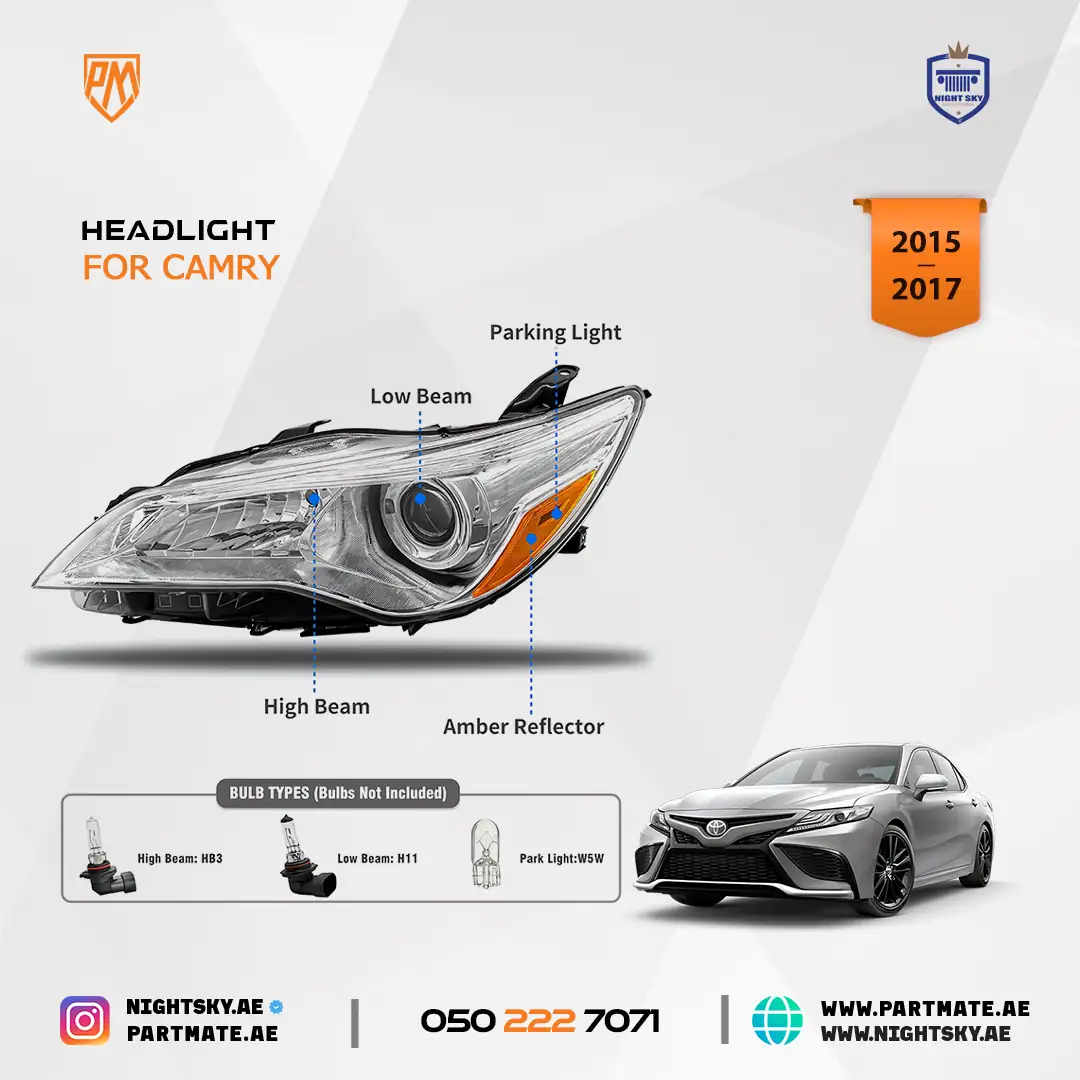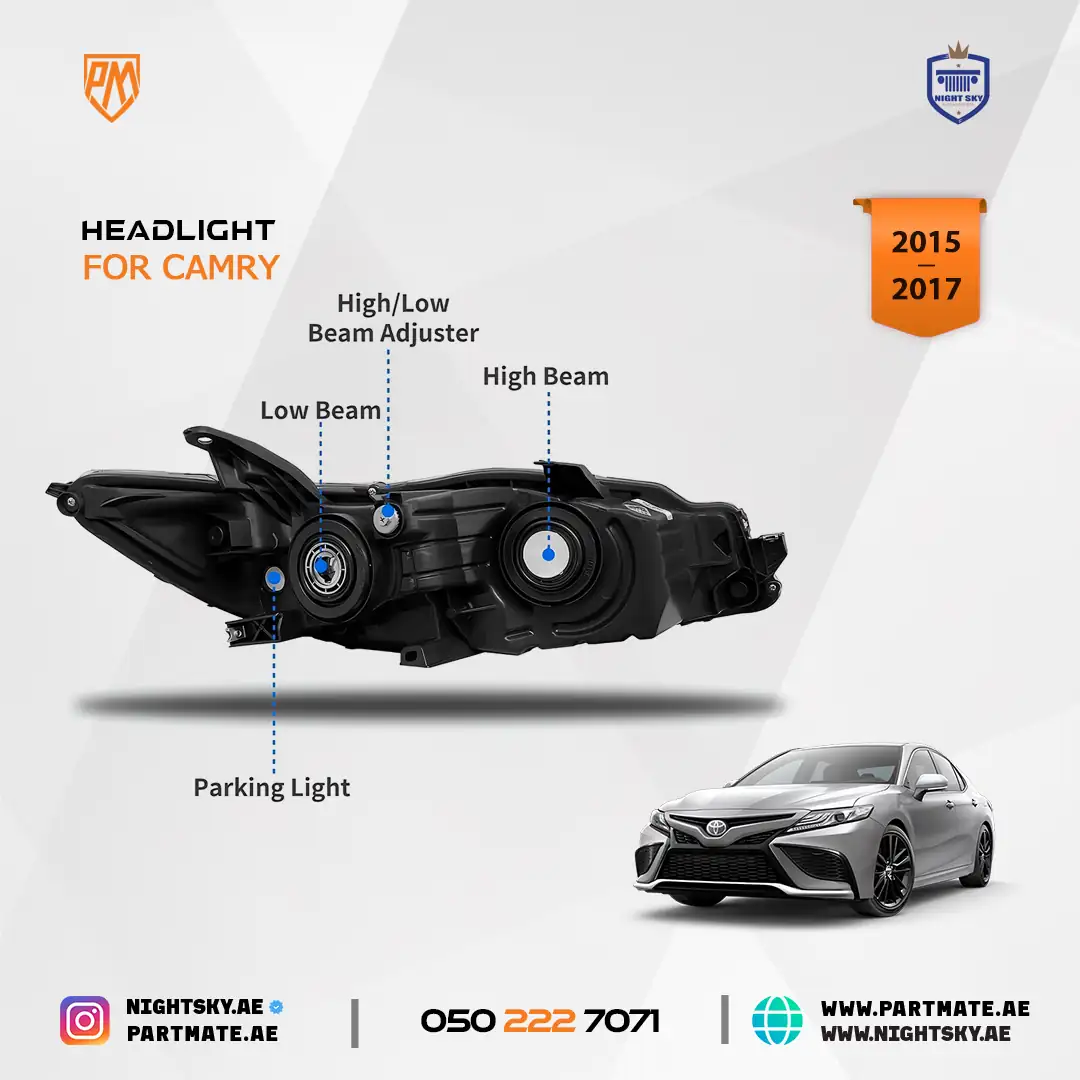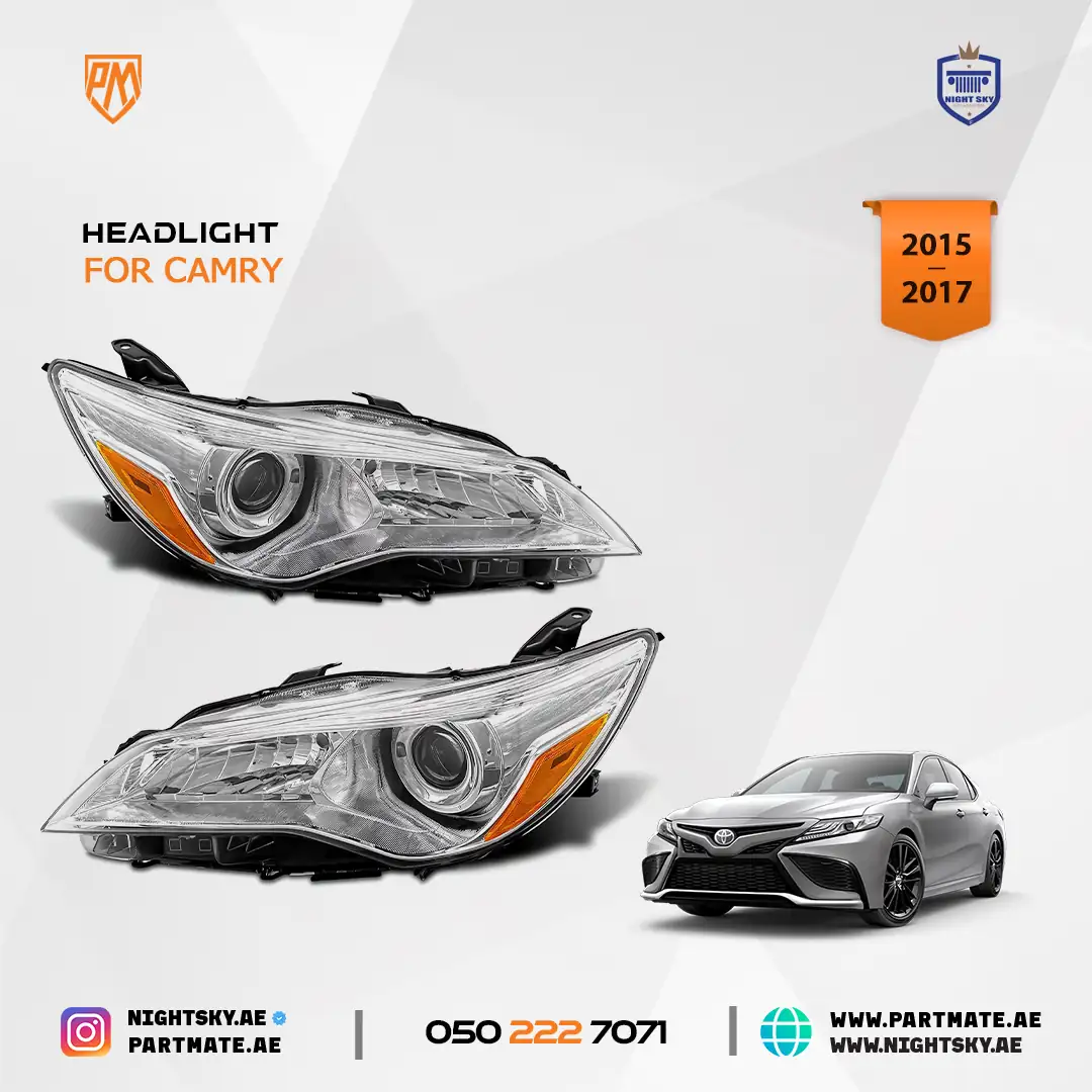 Upgrade the safety and appearance of your vehicle with this Toyota Camry headlight assembly for 2015β2017 models. Designed as a direct replacement for worn or damaged factory headlights, this set includes both left and right headlamp assemblies with a clean chrome housing that complements the original styling of the Camry.