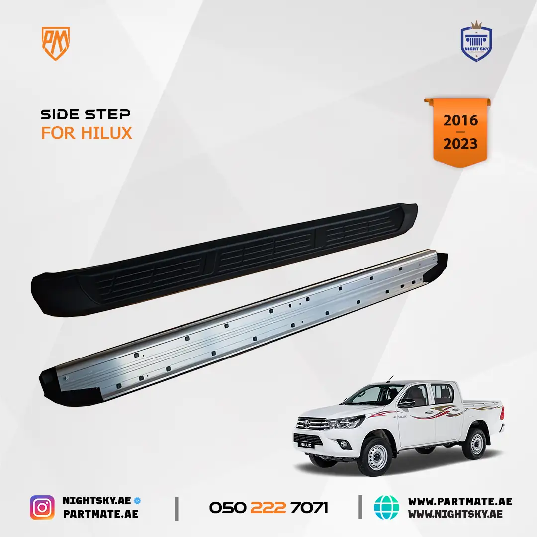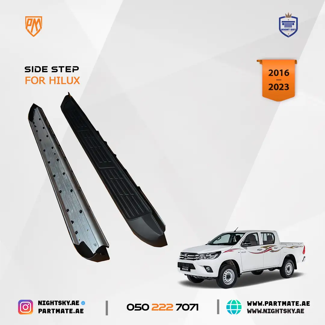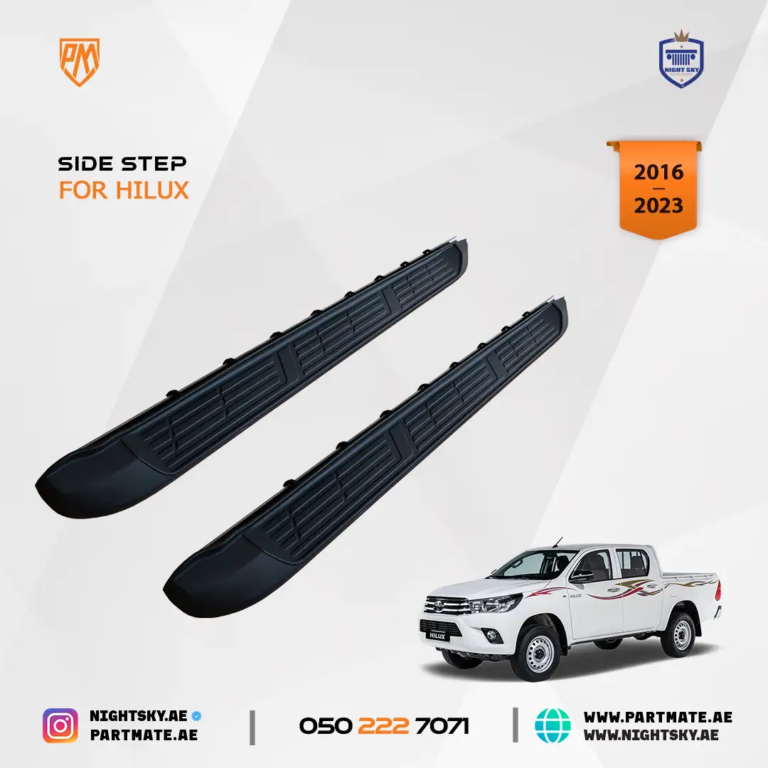 Upgrade convenience, protection, and styling on your Toyota Hilux Revo 2016-2023 with these premium side step running boards. Designed for durability and functionality, these steps provide a stable stepping surface for easier entry and exit while enhancing the rugged pickup appearance β perfect for daily driving, work use, and off-road adventures across Dubai and the UAE.