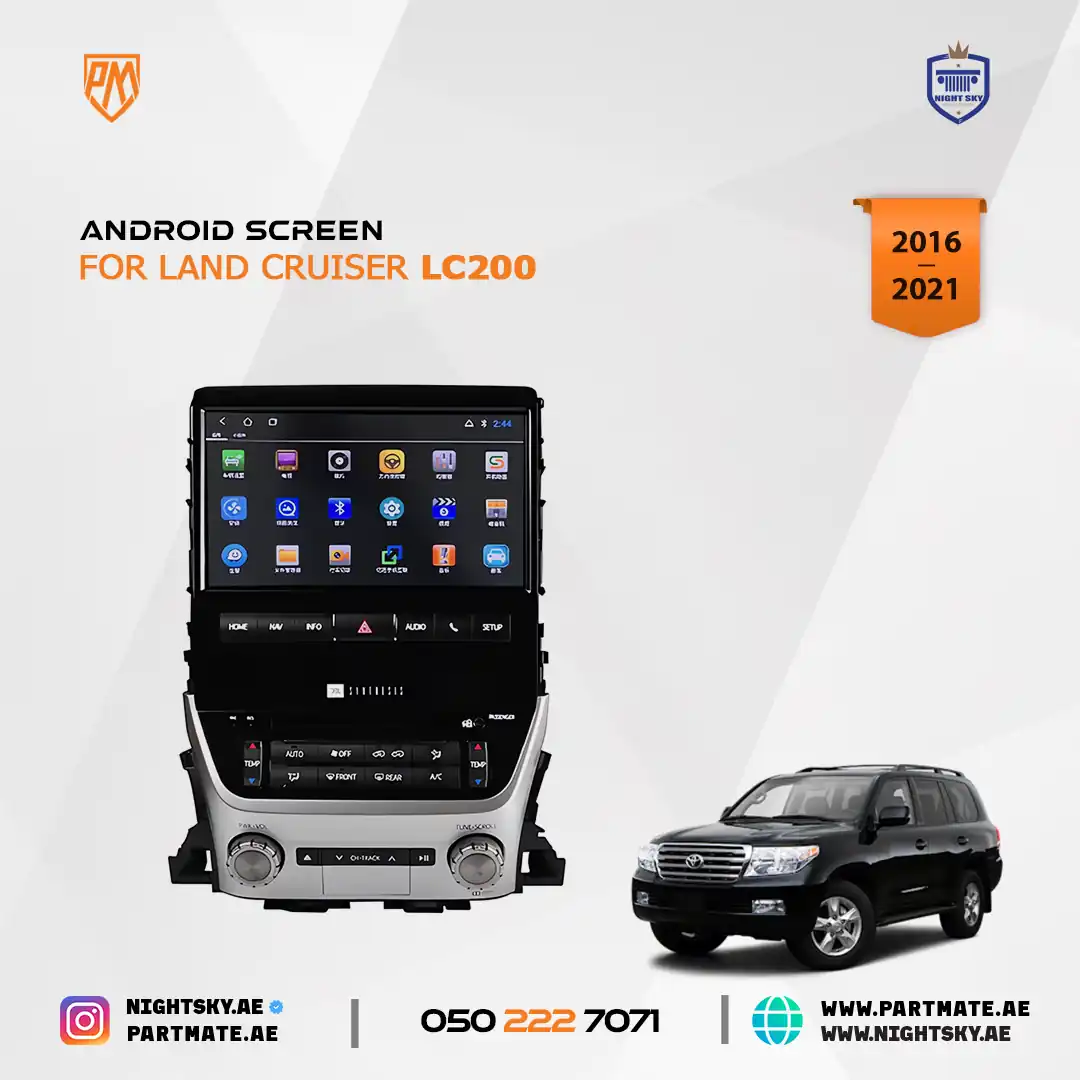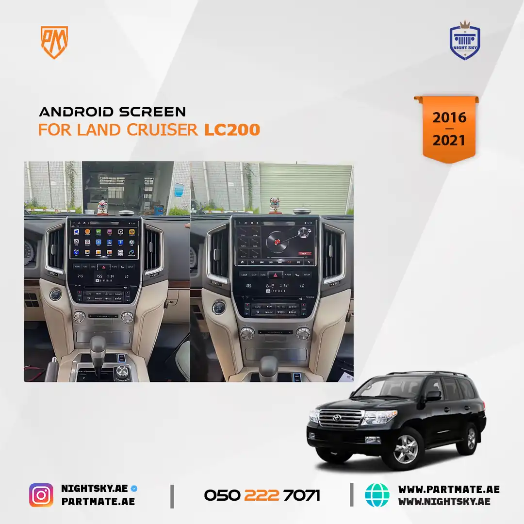 Upgrade your Land Cruiser’s tech with this advanced Android screen designed for LC200 models from 2016 to 2021. Offered by PartMate and supported by Night Sky Auto in Dubai and Sharjah, it brings modern connectivity and a premium infotainment experience.