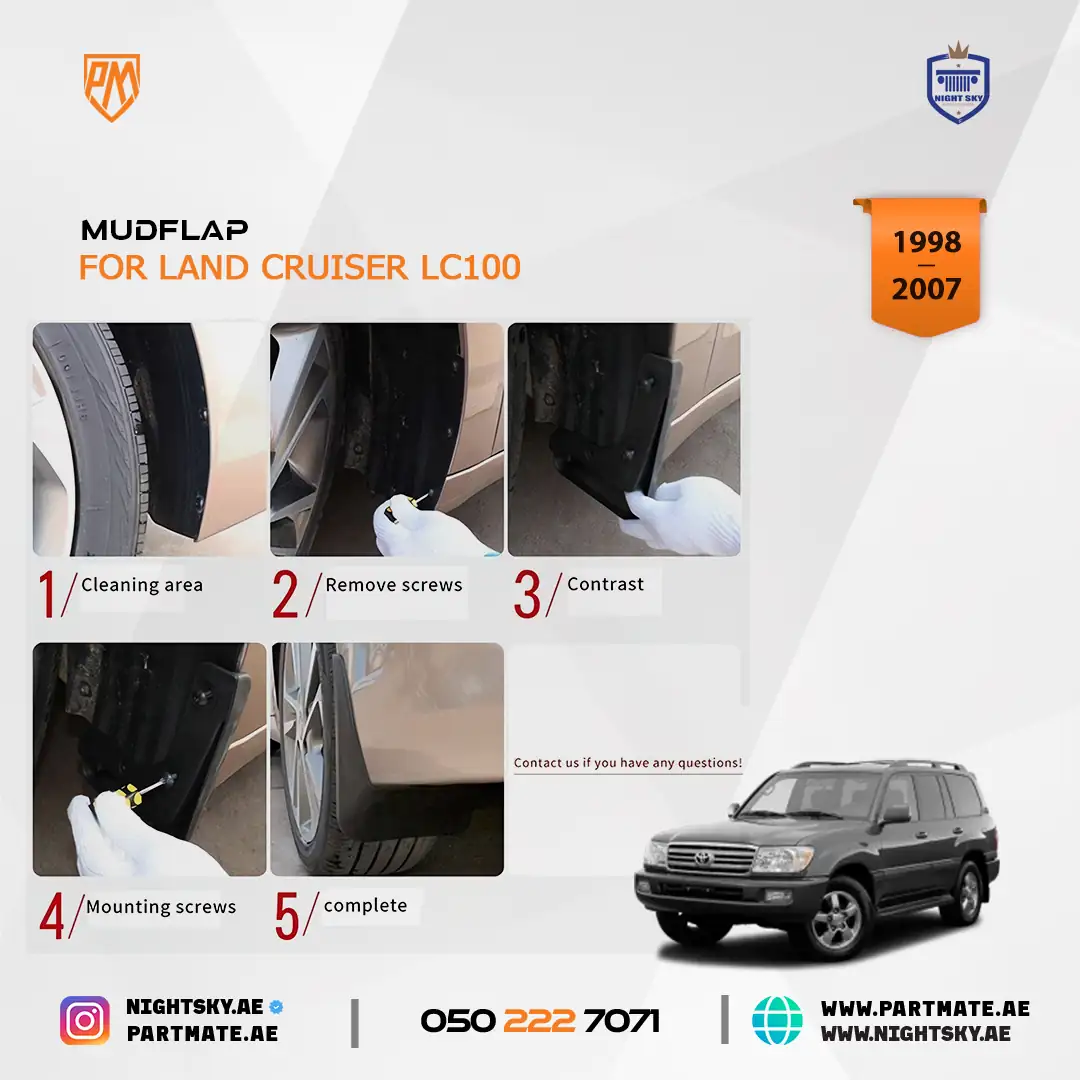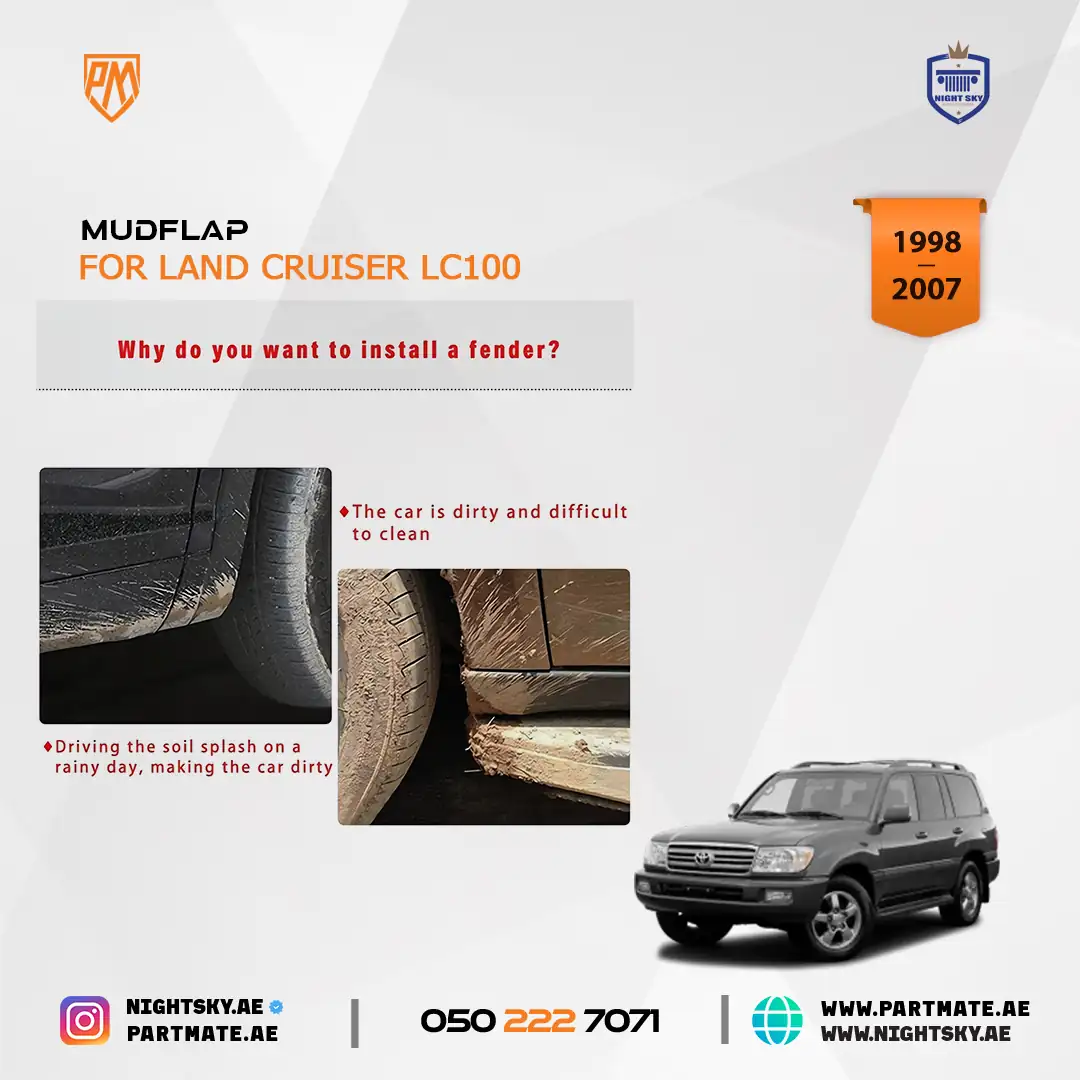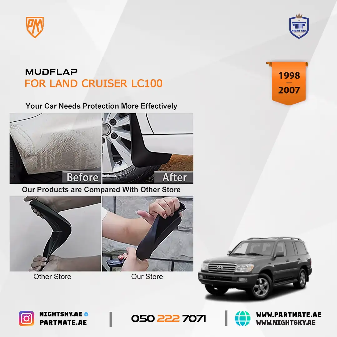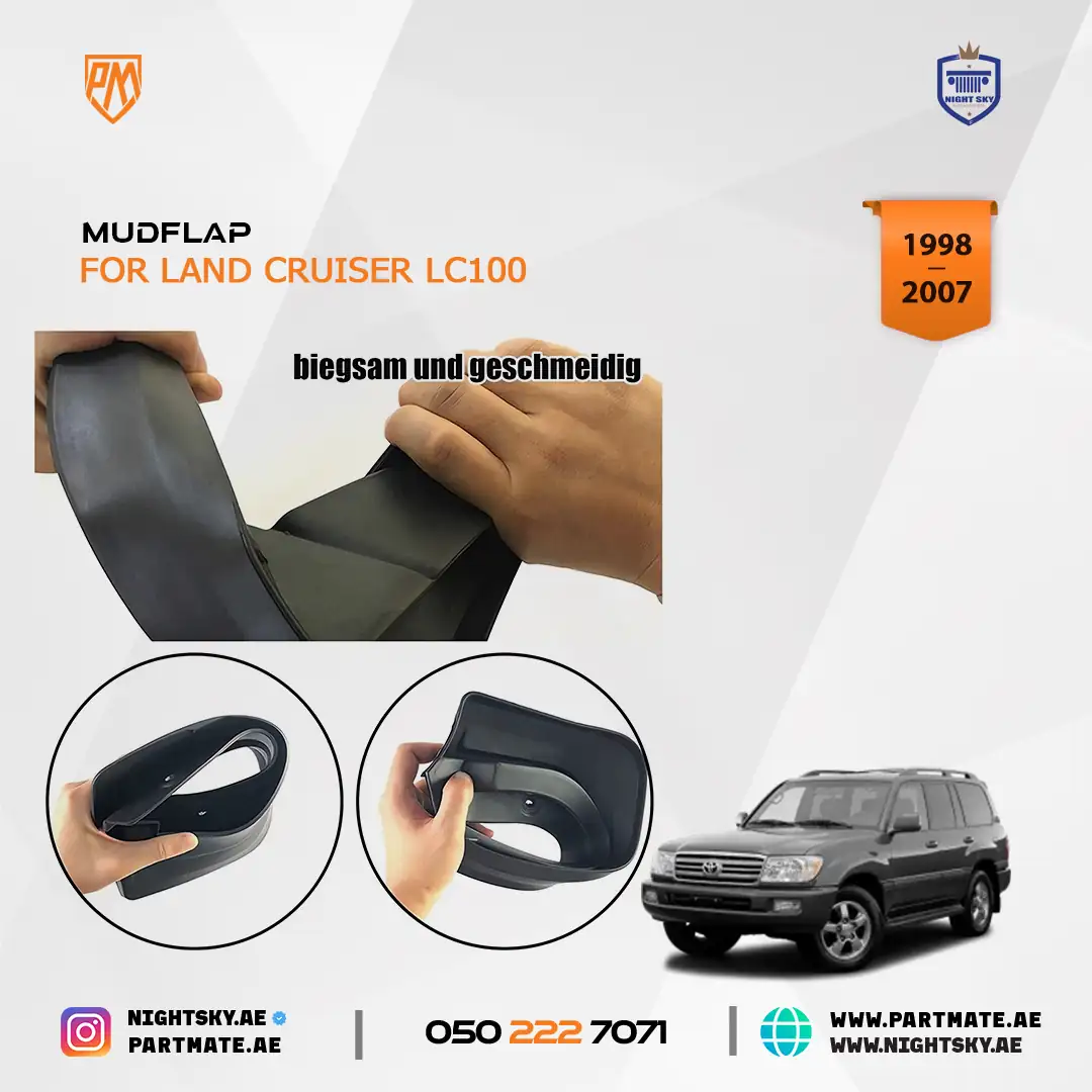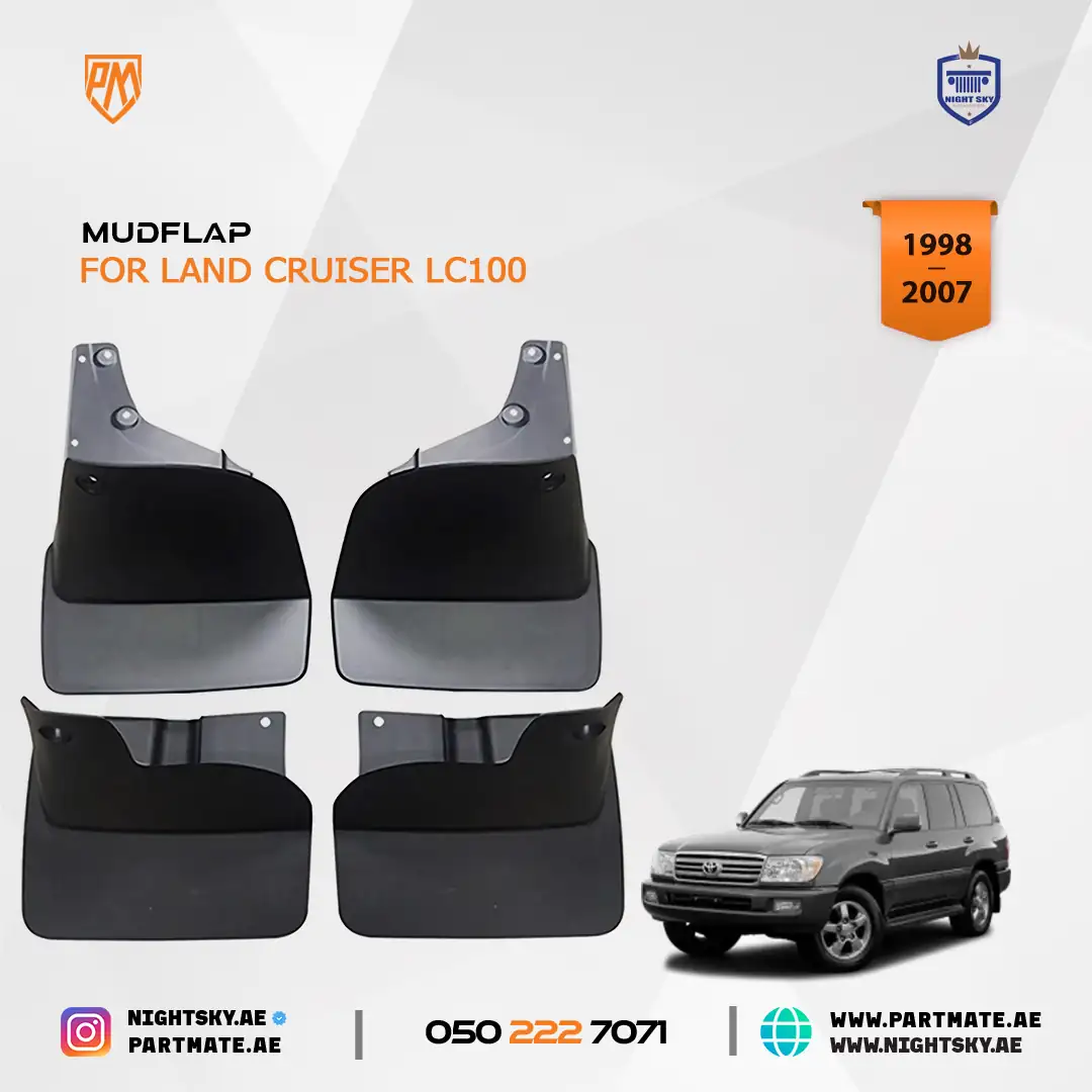 The Mudflap Fender Mud Guard Set is designed to protect your Toyota Land Cruiser LC100 / FJ100 from mud, stones, and road debris. Compatible with models from 1998 to 2007, these splash flaps help keep your vehicle cleaner while reducing paint and underbody damage—ideal for daily driving and off-road conditions in Dubai, Sharjah, and across the UAE.