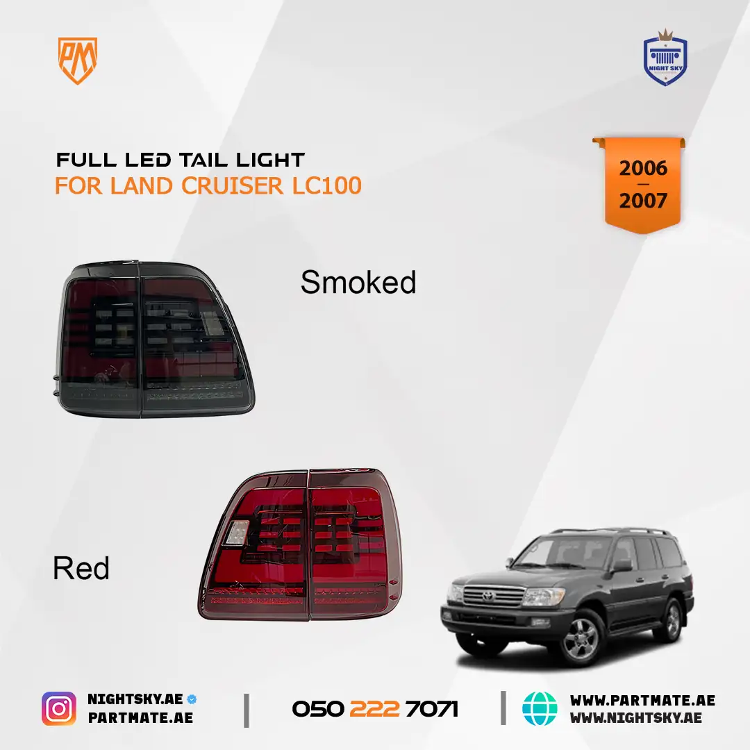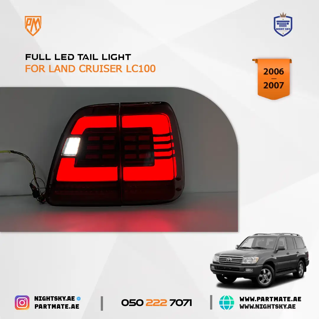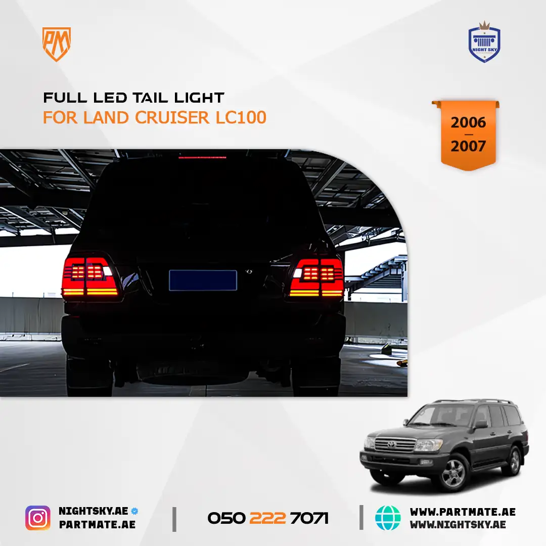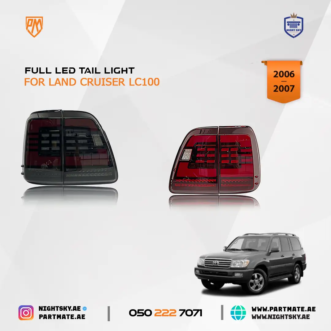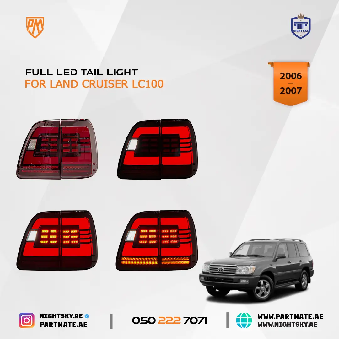 The LED Tail Lights for Toyota Land Cruiser LC100 are designed to upgrade rear visibility, safety, and modern styling for 2006–2007 models. Featuring bright LED illumination and a clean OEM-style design, these tail lamps improve braking visibility and add a refreshed look—ideal for daily driving and off-road use in Dubai, Sharjah, and across the UAE.