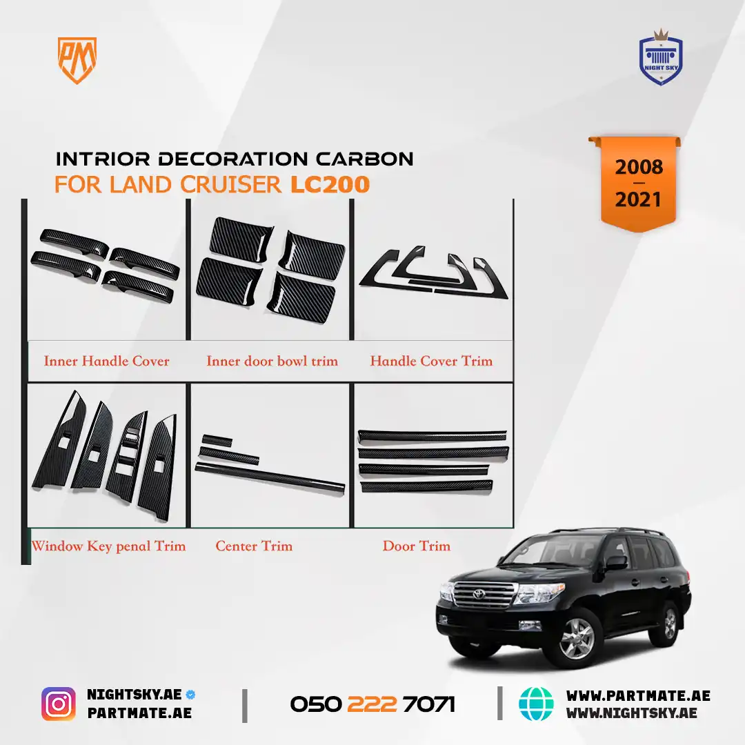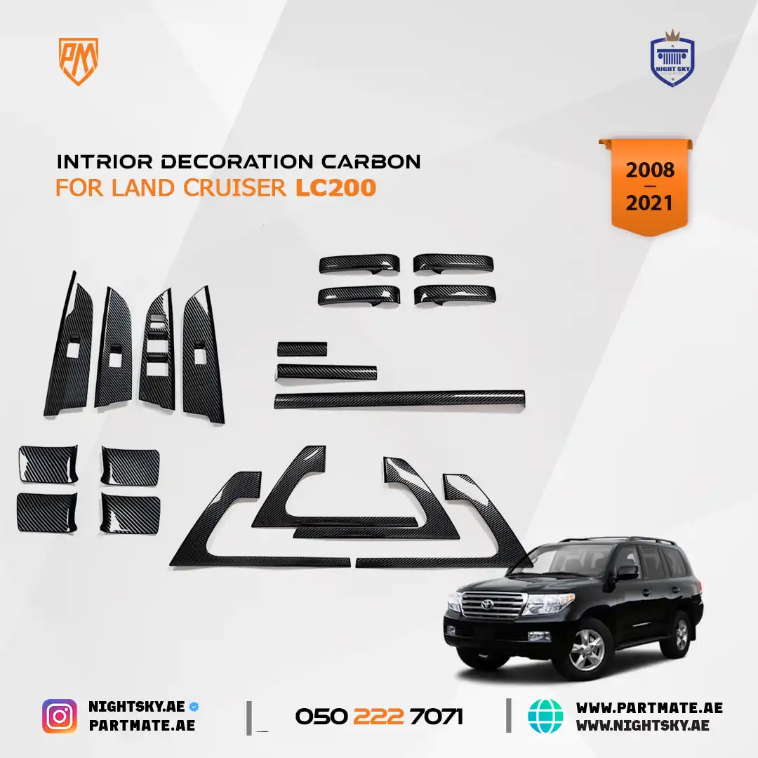 Give your LC200 cabin a bold, modern upgrade with this carbon look interior decoration set. Offered by PartMate and backed by Night Sky Auto in Dubai and Sharjah, this trim kit transforms your SUV’s interior with a sleek, performance-inspired aesthetic.