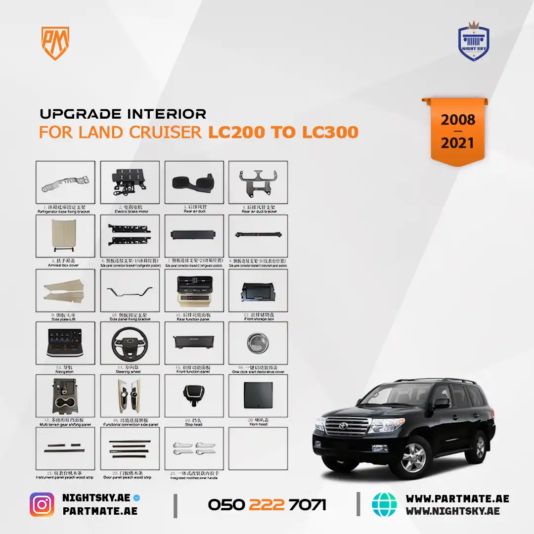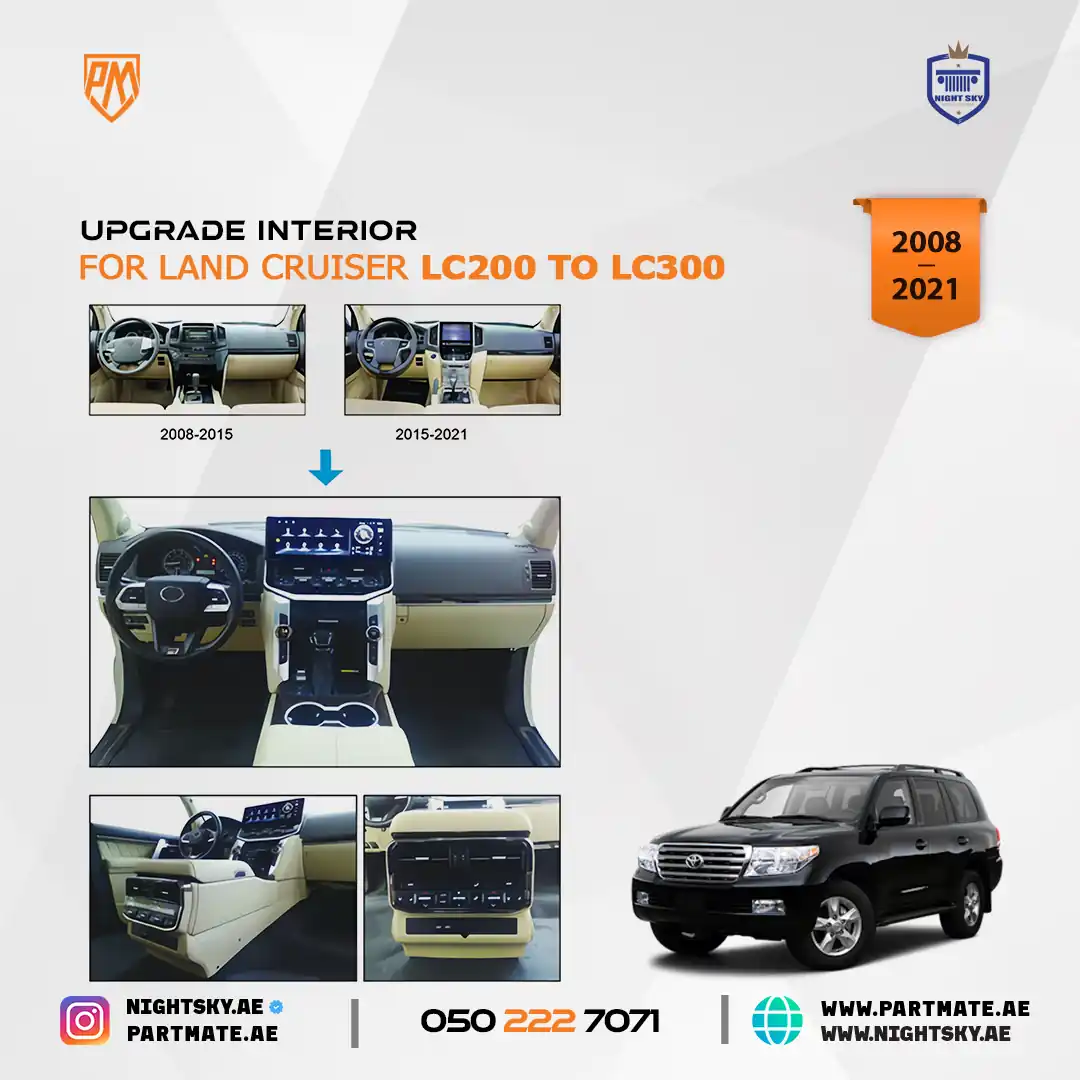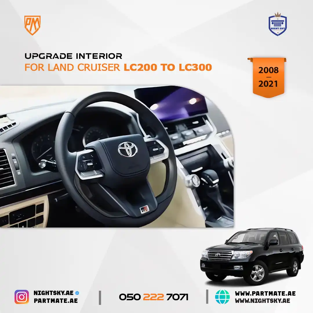 Transform your LC200 into a modern LC300-style cabin with this premium interior upgrade kit. Offered by PartMate and backed by Night Sky Auto in Dubai and Sharjah, it delivers a dramatic refresh inspired by the 2024 Land Cruiser design language.