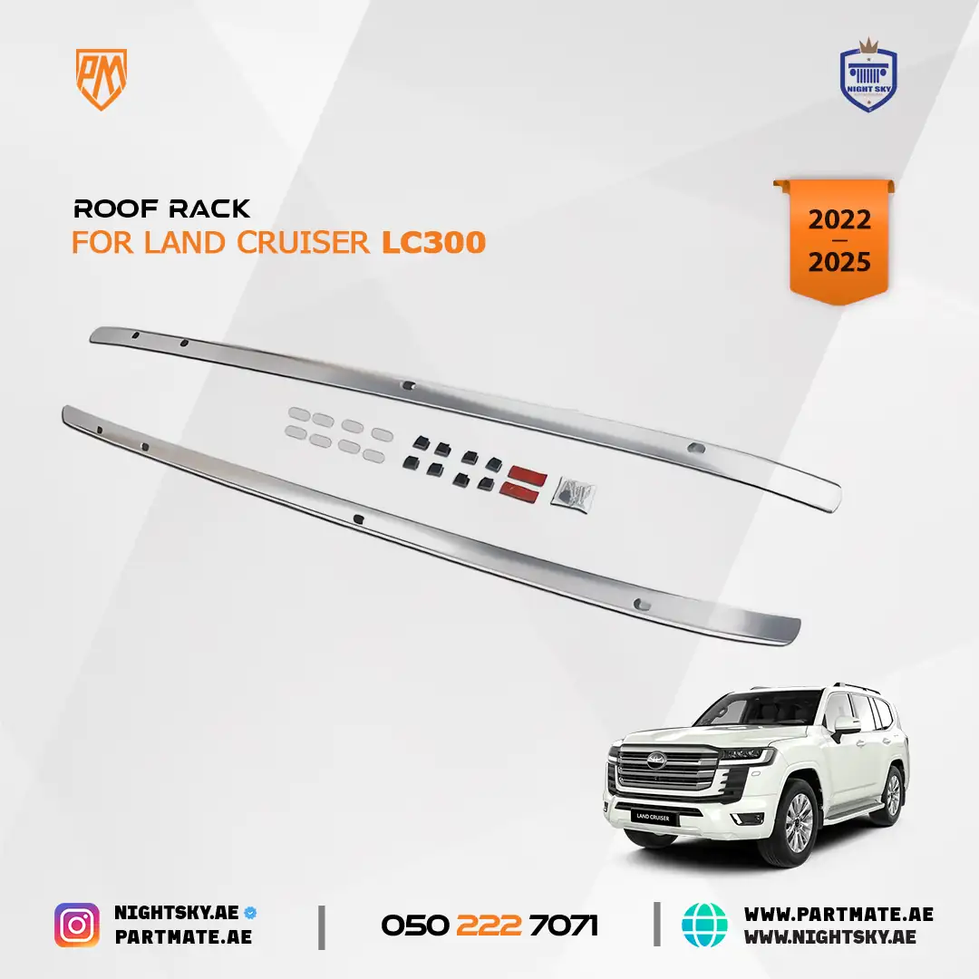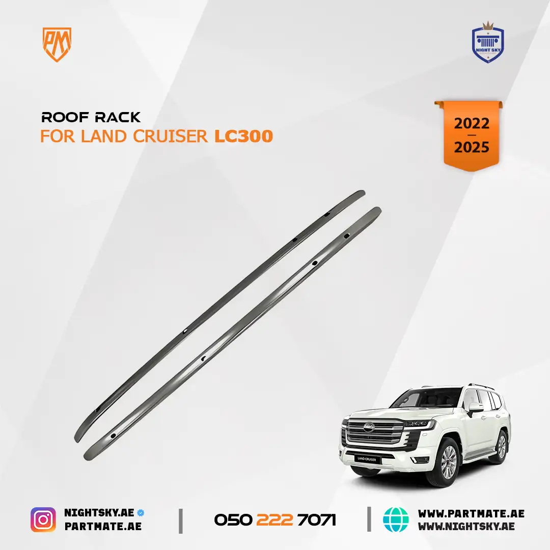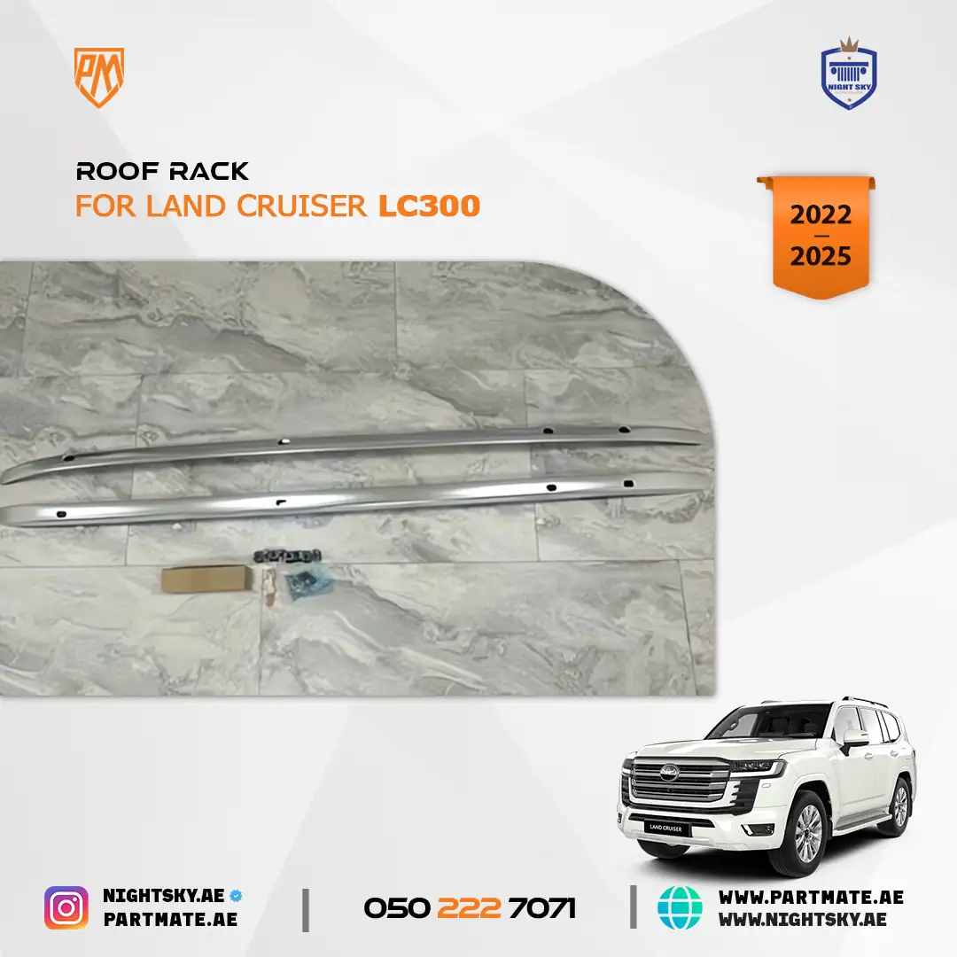 The Roof Rails / Roof Rack Side Rail Bars are engineered to expand cargo and luggage carrying capability for the Toyota Land Cruiser LC300 / J300. Designed for 2021–2023 models, these side rails provide a strong, OEM-style base for roof racks, cross bars, and cargo boxes—perfect for travel, family trips, and overlanding across Dubai, Sharjah, and the UAE.
