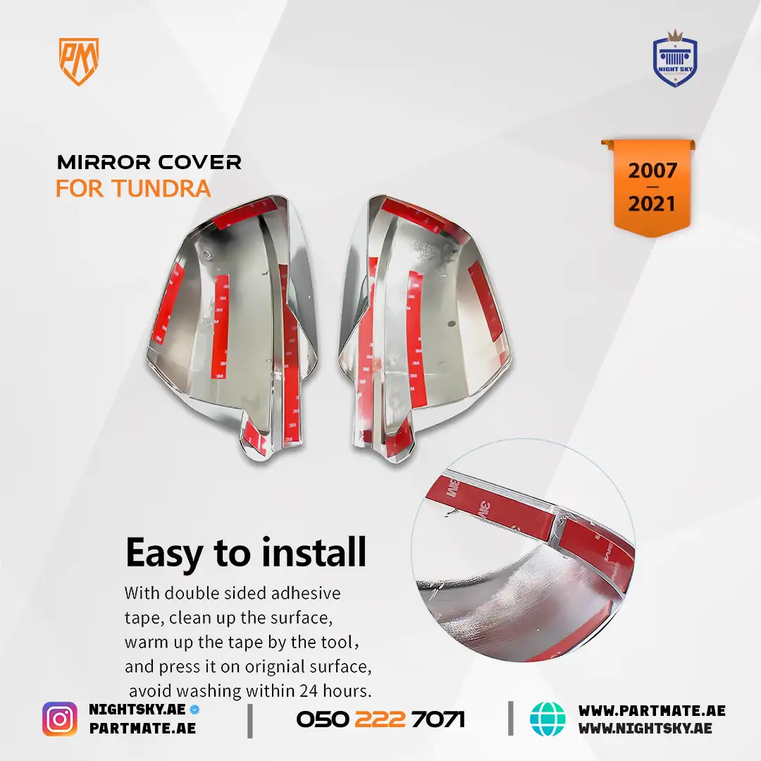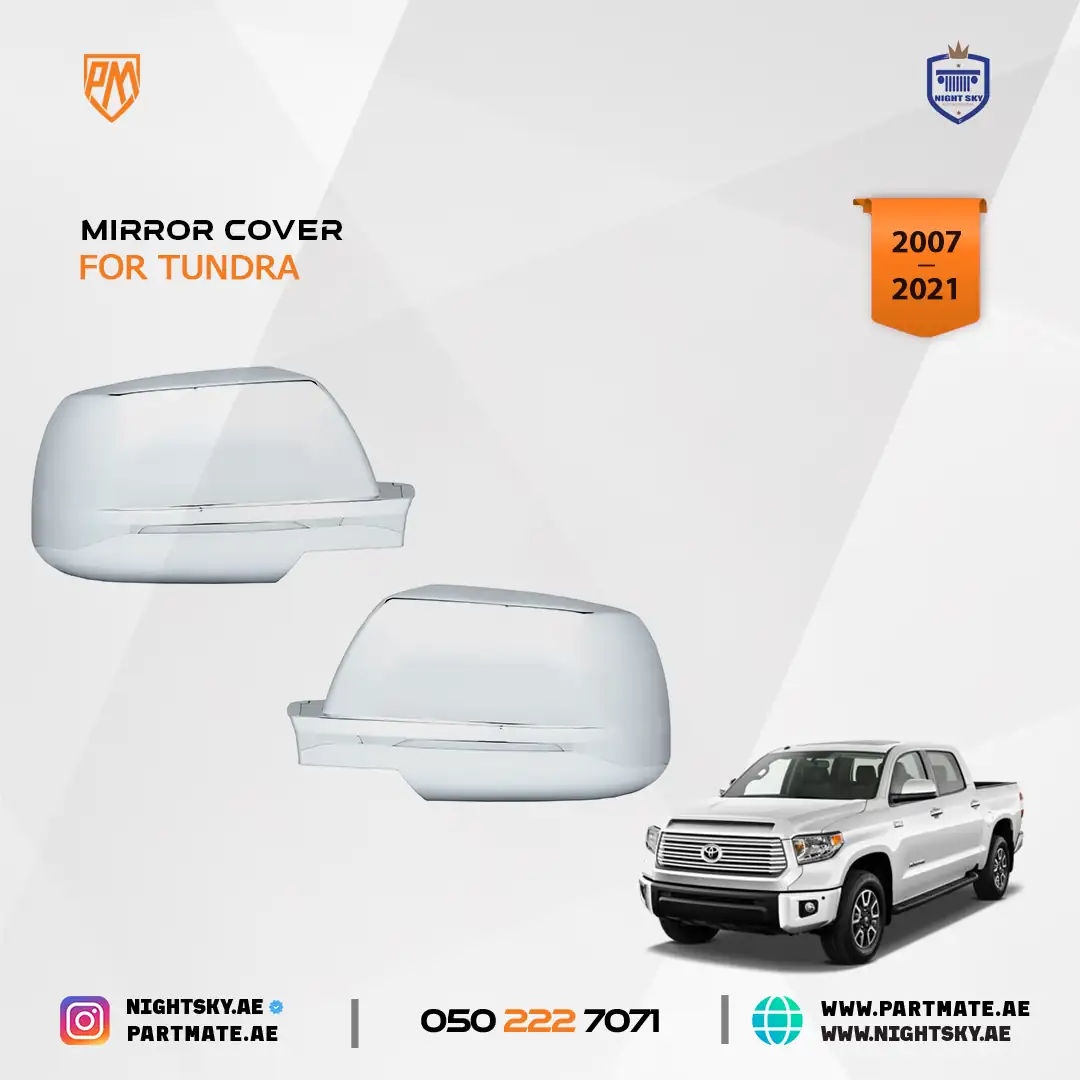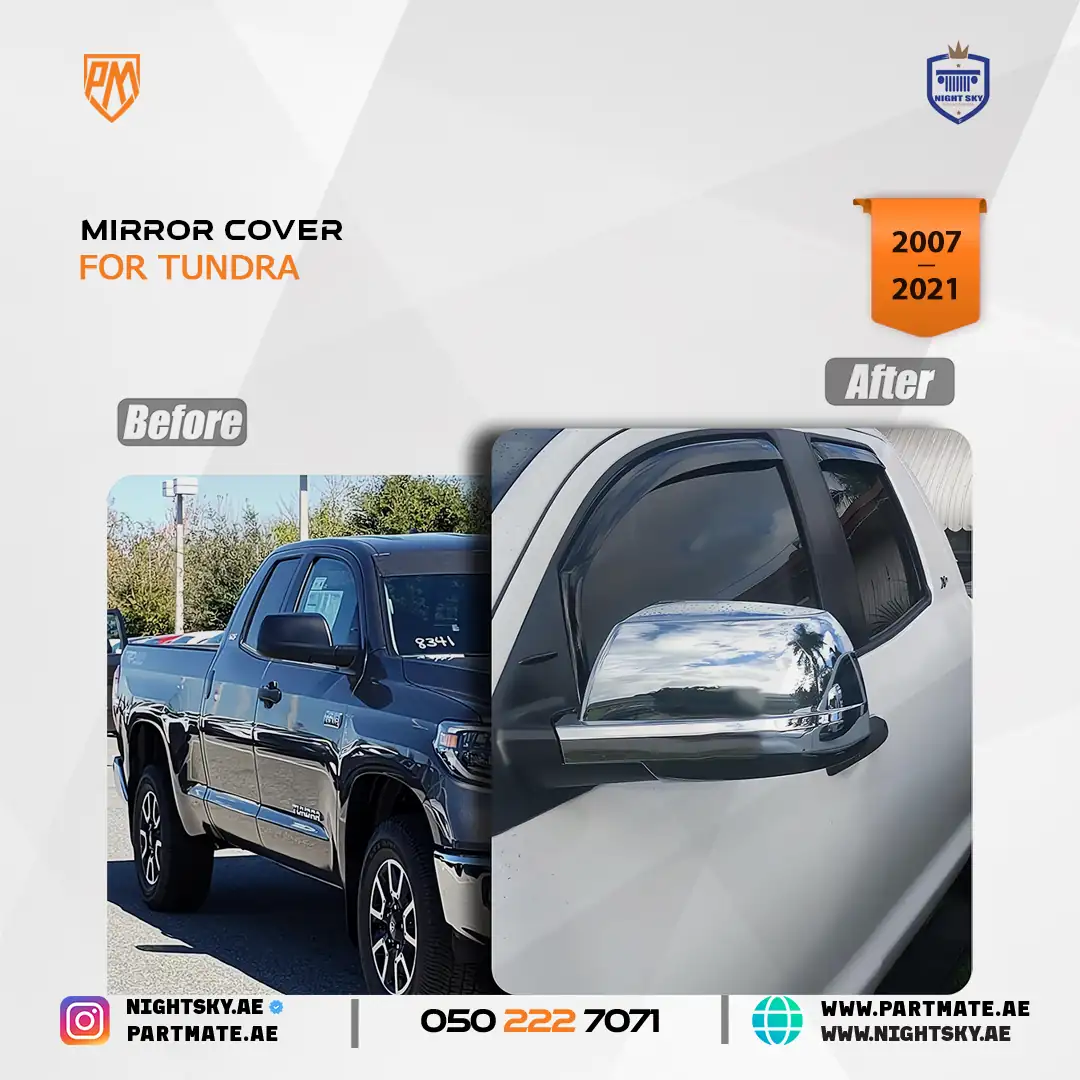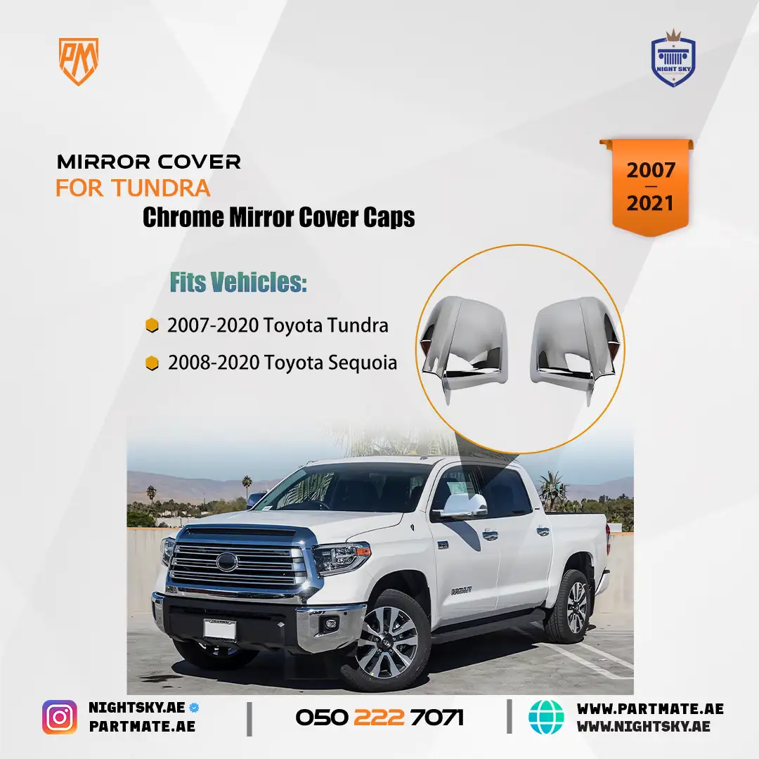 The Chrome Full Mirror Cover is designed to enhance the exterior styling of your Toyota Tundra while protecting the original side mirrors. Compatible with 2007–2021 models, this full-coverage chrome mirror cap set adds a premium OEM-style shine, making it an ideal upgrade for trucks driven in Dubai, Sharjah, and across the UAE.